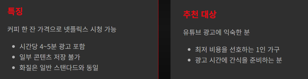 | 요금제 | 월 요금 | 화질 | 동시 접속 | 광고 여부 |