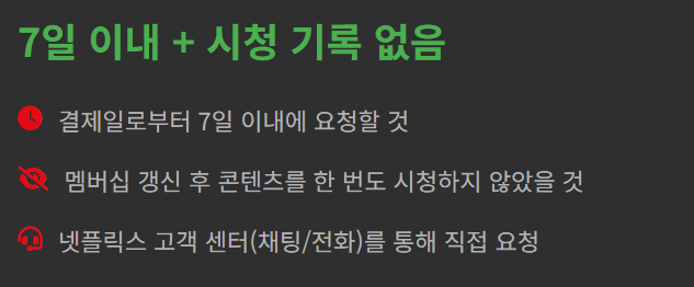 단순히 다음 달 결제를 막는 자동 결제 취소가 아니라, 이미 결제된 금액을 돌려받고 즉시 시청을 중단하고 싶은 경우라면 다음 조건을 확인해야 합니다.