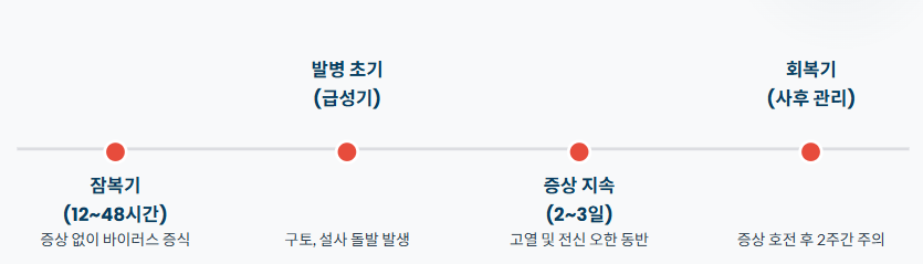 노로바이러스의 잠복기는 평균 12시간에서 48시간 사이입니다. 바이러스가 체내에 들어온 뒤 짧은 휴지기를 거쳐 폭발적으로 증식하며 증상을 유발합니다.