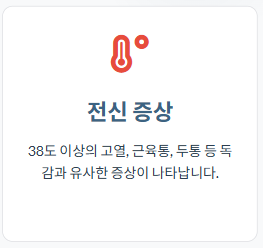 - 전신 증상: 근육통, 두통, 오한, 그리고 38도 이상의 고열이 함께 나타나 독감과 혼동되기도 합니다.