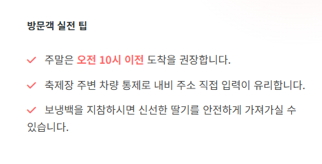 - 준비물 체크리스트: 야외 공원 특성상 그늘이 부족할 수 있으니 선글라스와 모자를 준비하세요. 또한, 딸기 잼이나 신선한 딸기를 저렴하게 직판하므로 구매 후 담아갈 보냉백을 챙기면 신선도를 유지하는 데 도움이 됩니다.