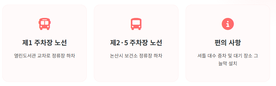 - 제2·5 주차장 이용 시: 논산시 보건소 정류장 하차