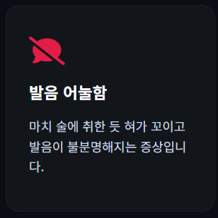 - 갑자기 발음이 어눌해지거나(설소리가 남), 하고 싶은 말이 입 밖으로 잘 나오지 않습니다. 상대방의 말을 이해하지 못하는 경우도 포함됩니다.