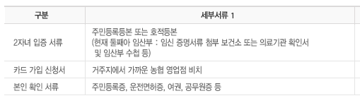 신청 시 제출서류는 2자녀 입증서류(주민등록등본 및 호적등본), 카드가입신청서(가까운 농협에 비치), 본인확인서류(주민등록증, 운전면허증 등등) 준비하셔야 합니다.