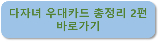 다자녀 우대카드는 다자녀가족이시면 일부 지방자치단체에서 생활안전 지원을 위해 마트, 식당, 레저, 문화시설 등등 관련업체 이용 시 할인 혜택과 면제 해택을 받을 수 있습니다.