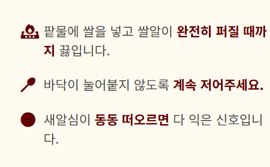 - 쌀알이 퍼질 때까지 바닥이 눌어붙지 않도록 주걱으로 계속 저어주세요.