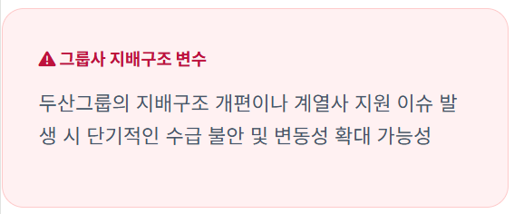 - 재무적 변수: 두산그룹의 지배구조 개편이나 계열사 지원 이슈가 발생할 경우 단기적 변동성이 커질 수 있습니다.