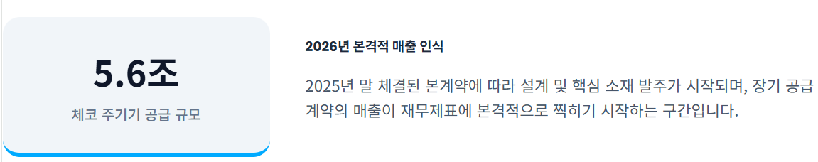 - 체코 원전 본계약: 2025년 말 체결된 체코 원전 본계약의 매출이 2026년부터 본격 반영됩니다.