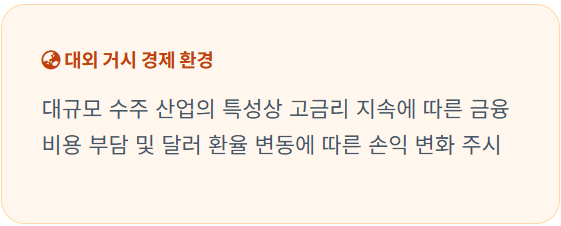 • 금리 및 환율: 대규모 수주 산업 특성상 달러 환율 변동과 금리 추이에 따른 금융 비용 변화를 주시해야 합니다.