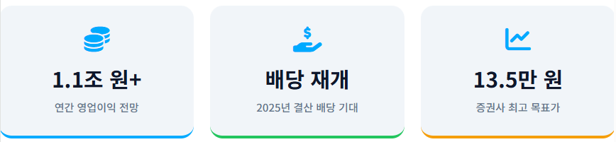 • 배당 재개 가능성: 2025년 회계연도 기준 영업이익이 1조 원대를 회복하고, 당기순이익이 흑자로 확실히 돌아섬에 따라 **2026년 초(결산 배당)**부터 배당금 지급 가능성이 매우 높게 점쳐지고 있습니다.