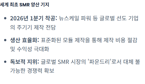 - SMR 전용 공장 착공: 2026년 1분기 중 세계 최초의 SMR 전용 제작 공장 착공이 예정되어 있어, SMR 대량 생산 시대의 독보적 지위를 굳힐 전망입니다.