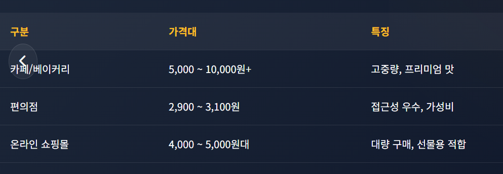 - 카페 가격: 개당 5,000원 ~ 10,000원 이상 (가장 비쌈)