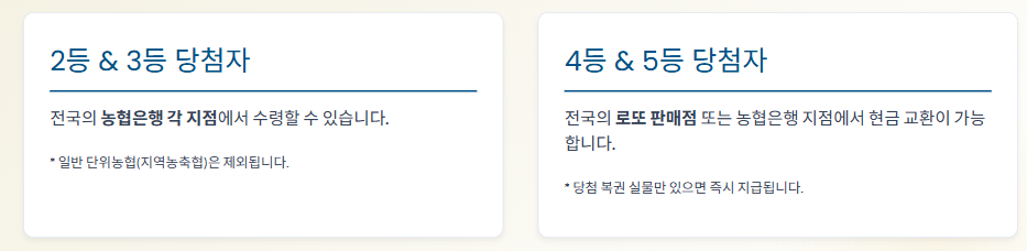 - 2등 및 3등: 농협은행 각 지점에서 수령 가능합니다. 역시 당첨복권과 신분증이 필요합니다.