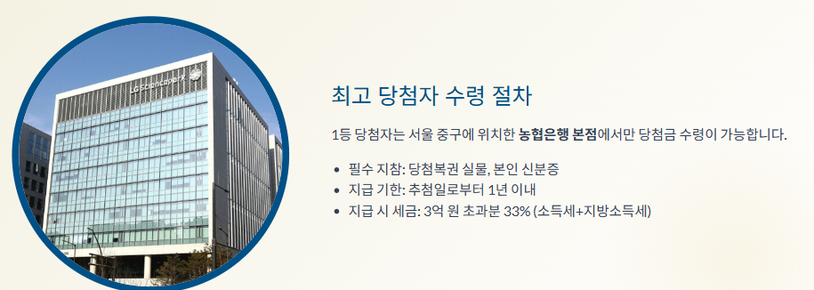 - 1등: 농협은행 본점에서 지급받을 수 있습니다. 당첨복권과 신분증을 반드시 지참해야 합니다.