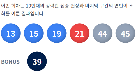 보너스 번호: 2등 당첨 여부를 가르는 결정적인 숫자인 보너스 번호는 39번으로 확정되었습니다. 번호 분포 특징: 이번 회차는 단번대와 30번대(보너스 제외)가 전멸한 대신, 10번대와 40번대 후반에 번호가 몰리는 독특한 분포를 보였습니다.