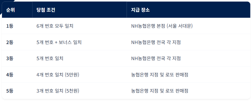 1등 (6개 번호 일치): 당첨 번호 6개를 모두 맞힌 행운의 주인공은 농협은행 본점에서만 당첨금 수령이 가능합니다. 거액의 자산이 이동하는 만큼 보안과 절차에 주의가 필요합니다.