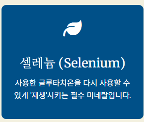 셀레늄은 사용된 글루타치온이 다시 자기 역할을 할 수 있도록 '재생'시켜주는 필수 미네랄입니다. 셀레늄이 부족하면 글루타치온은 반쪽짜리 효과밖에 내지 못합니다.