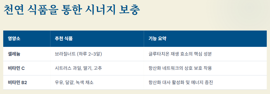 글루타치온 혼자 일하게 두지 마세요. 다음 영양소들과 함께할 때 시너지는 극대화됩니다.