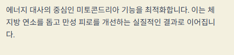 에너지 대사에 관여하여 체지방 연소를 돕고 인슐린 감수성을 높임으로써 만성 피로 개선과 성인병 예방에 기여합니다.
