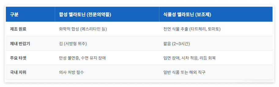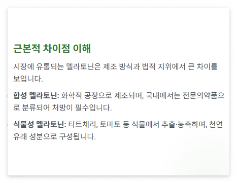 | 구분 | 합성 멜라토닌 (처방 의약품) | 식물성 멜라토닌 (천연 유래/보조제) |