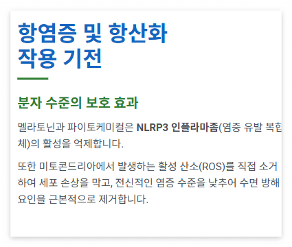멜라토닌은 세포 손상을 유발하는 미토콘드리아 유래 활성 산소종(ROS)을 소거함으로써 강력한 항산화 역할을 수행하며 6, 이는 세포 보호 작용으로 이어진다. 분자 수준에서, 멜라토닌은 $\text{NLRP}3$ 인플라마좀(Inflammasome)과 같은 염증 매개체의 발현을 조절하여 항염증 활성을 나타낸다.8 $\text{NLRP}3$ 인플라마좀은 환경적 자극, 내인성 위험 신호, 병원체, 그리고 손상된 미토콘드리아에서 방출된 $\text{ROS}$ 등에 반응하는 손상 신호 경로의 핵심 요소이다.8 또한, 타트체리에 함유된 멜라토닌과 파이토케미컬은 $\text{JAK}/\text{STAT}$ 신호 전달 경로를 통해 항염증 활성을 나타내며, 산화 스트레스와 염증을 감소시켜 수면 사이클을 개선하는 데 기여할 수 있다.6