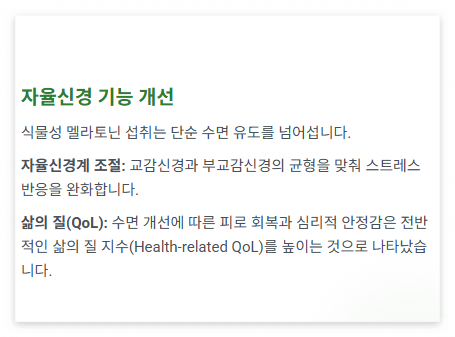 앞서 언급된 임상 연구는 식물성 멜라토닌 섭취가 단순히 수면 지표만 개선하는 것이 아니라, 자율신경 기능(Autonomic Nervous System) 및 건강 관련 삶의 질(Health-related Quality of Life)의 생리적 및 심리적 영역 모두에 긍정적인 영향을 미친다는 것을 보여주었다.3