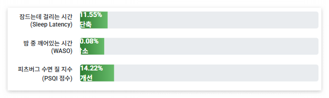 | 잠드는 데 걸리는 시간 (Sleep Latency) | 단축 | 11.55% | 입면 장애 개선 효과 시사 3 |
