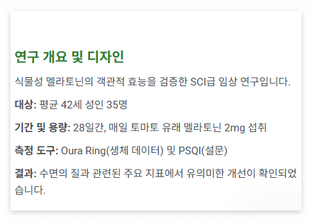 식물성 멜라토닌의 수면 개선 효능을 평가하기 위한 임상 연구가 SCI(E)급 국제학술지에 게재된 바 있다.3 이 연구는 평균 나이 42세의 성인 35명을 대상으로 28일간 진행되었으며, 참가자들은 취침 전 매일 2mg의 토마토 과일 추출물 유래 식물성 멜라토닌을 섭취했다.3