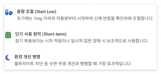 - 용량 조절: 처음 복용 시에는 1mg 이하의 저용량부터 시작하여 자신의 신체 반응을 확인하는 것이 권장된다.5
