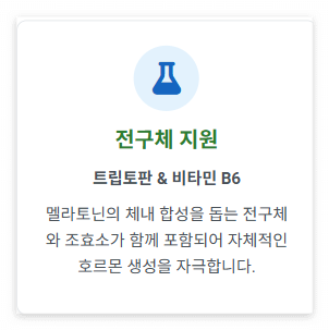 이 보조 성분들은 멜라토닌의 생리 활성을 상호 보완적으로 지원한다. 예를 들어, 트립토판, 마그네슘, 비타민 B6 등은 멜라토닌의 체내 합성을 직접적으로 도와준다.5 더욱이, 타트체리 등에 풍부한 폴리페놀 화합물은 강력한 항산화 및 항염증 효과를 발휘한다.6 이 항산화 작용은 멜라토닌의 $\text{MT}_1/\text{MT}_2$ 수용체 기능을 간접적으로 지원하고 염증 반응을 감소시켜, 수면 조절에 방해가 되는 전신적 스트레스 상태를 완화한다. 이러한 복합적인 작용은 단순한 수면 유도제 역할 이상으로 수면의 질 개선뿐만 아니라 자율신경 기능 및 전반적인 삶의 질 개선 3이라는 다각적인 결과를 도출하는 핵심적인 기전으로 분석된다.