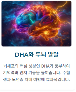 - DHA의 역할: DHA는 뇌 세포의 주요 구성 성분이며, 기억력과 인지 기능 향상에 필수적입니다. 특히 수험생이나 노년층의 뇌 건강 유지에 긍정적인 영향을 미칩니다.