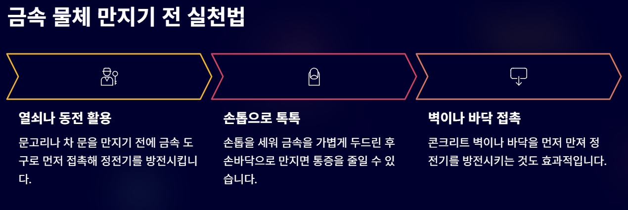 - 금속 물체 만지기 전: 문고리나 차 문 등 금속 제품을 만지기 전에 열쇠나 동전과 같은 금속 도구를 사용해 먼저 접촉하여 정전기를 방전시키거나, 손톱을 세워 톡톡 두드린 후 만지면 통증을 줄일 수 있습니다.