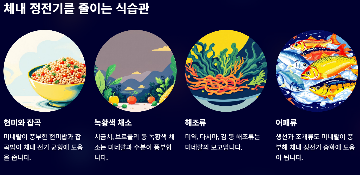 일부 자료에서는 미네랄이 풍부한 식단이 체내 정전기 중화에 도움이 된다고 언급하기도 합니다.
