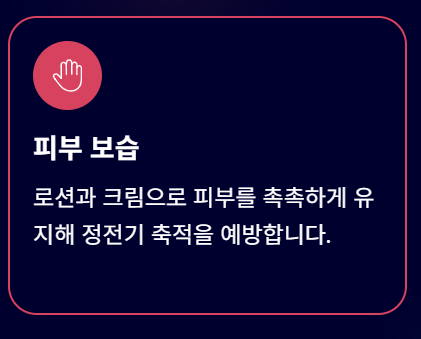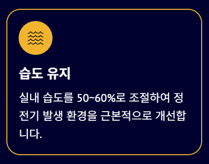 - 실내 습도 조절: 가습기를 사용하거나 젖은 빨래를 널어 **실내 습도를 40% 이상(50%~60% 권장)**으로 유지합니다.