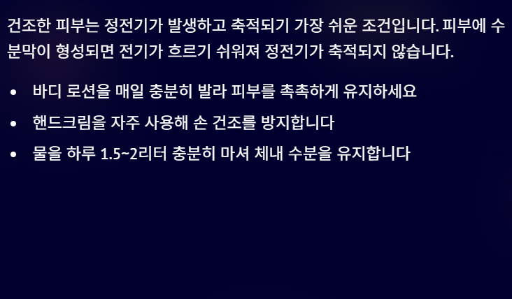 - 피부 보습: 피부가 건조할수록 정전기가 쉽게 발생합니다. 바디 로션, 핸드크림 등의 보습제를 충분히 발라 피부를 촉촉하게 유지하세요.