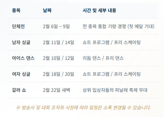 경기 일정은 대회 개막 직후인 2026년 2월 6일부터 2월 21일까지 약 2주간 진행됩니다. 주요 일정(한국 시간 기준)은 다음과 같습니다.