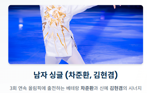 - 남자 싱글 (차준환, 김현겸): 한국 남자 피겨의 간판 차준환 선수는 이번이 벌써 세 번째 올림픽입니다. 노련한 경기 운영과 예술성을 바탕으로 메달권 진입을 노립니다. 신예 김현겸 선수 역시 패기 넘치는 연기로 함께 출전합니다.