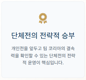 - 단체전의 비중 확대: 개인 종목 시작 전 열리는 단체전은 국가별 통합 기량을 겨루는 장입니다. 한국은 전 종목에서 고른 기량을 갖춘 만큼 단체전에서도 사상 첫 메달 가능성을 타진하고 있습니다.
