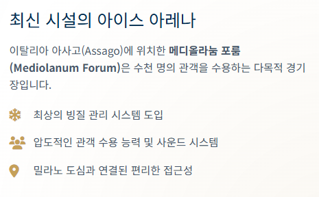 이번 올림픽 피겨 스케이팅 경기는 이탈리아 밀라노에 위치한 **메디올라눔 포룸(Mediolanum Forum)**에서 개최됩니다. 이 경기장은 수천 명의 관객을 수용할 수 있는 현대적인 아이스 아레나로, 선수들이 최상의 연기를 펼칠 수 있는 환경을 제공합니다.