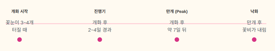 둘째, 지역별 편차입니다. 고도가 높은 지역이나 해안가 인접 지역은 일조량과 해풍의 영향으로 내륙 평지보다 1~2일 정도 개화가 늦어질 수 있습니다. 특히 서울 내에서도 남산이나 북한산 주변은 도심 평지보다 늦게 만개할 수 있으니 참고하시기 바랍니다.