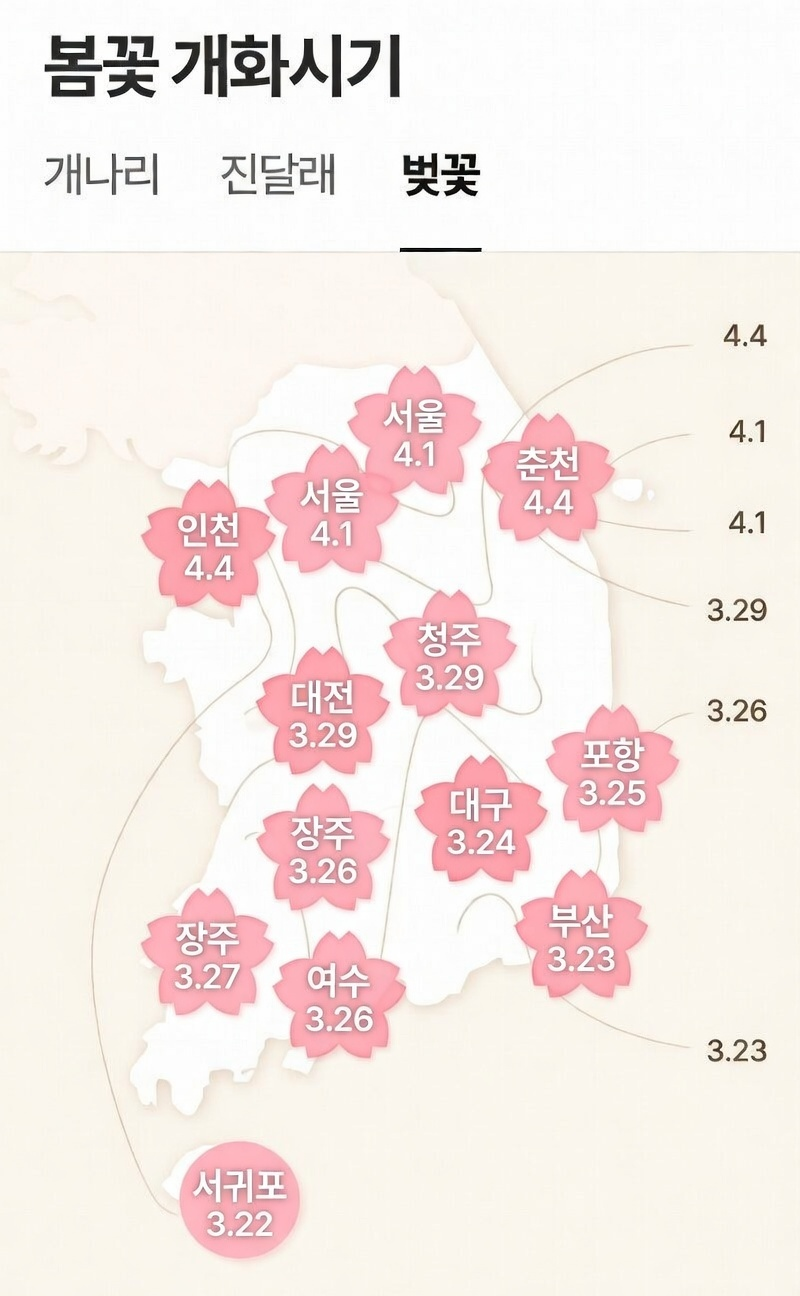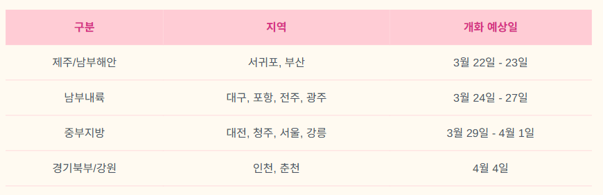- 중부 지방: 대전과 청주가 3월 29일, 서울과 강릉은 4월 1일경에 개화할 것으로 보입니다.