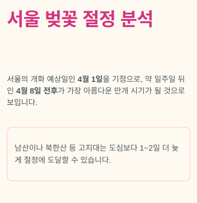 일반적으로 벚꽃은 개화일로부터 약 7일 후에 만개하여 절정에 이릅니다. 따라서 서울의 경우 4월 1일 개화 후 4월 8일 전후가 가장 아름다운 시기가 될 것입니다.