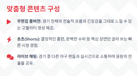 | 하이라이트 즐기기 | 쇼츠(Shorts) 및 짧은 클립 활용 | 바쁜 시간대에 핵심 장면만 빠르게 파악 |