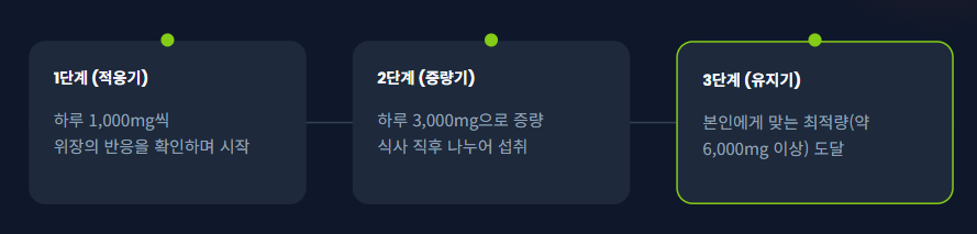 - 단계적 증량: 처음부터 3,000mg을 먹기보다 1,000mg으로 시작하여 설사나 속쓰림 증상이 없는지 확인하며 점진적으로 양을 늘립니다.