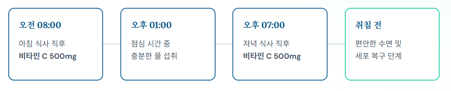 - 나누어 먹기: 한 번에 1,000mg 이상을 고용량으로 먹으면 흡수율이 떨어지고 소변으로 즉시 배출됩니다. 500mg씩 아침저녁으로 나누어 먹는 것이 혈중 농도를 일정하게 유지하는 데 유리합니다.