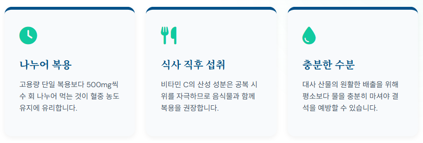 - 충분한 수분 섭취: 신장 결석의 이력이 있거나 우려된다면, 비타민 C 복용 시 물을 평소보다 많이 마셔 대사산물이 원활하게 배출되도록 도와야 합니다.