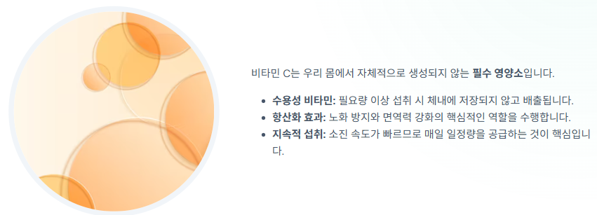 - 식사 중 또는 식사 직후: 비타민 C는 산성이 강해 빈속에 먹으면 속쓰림을 유발할 수 있습니다. 위장을 보호하고 음식물 속 영양소(철분 등)의 흡수를 돕기 위해 식사 직후에 드시는 것이 가장 좋습니다.