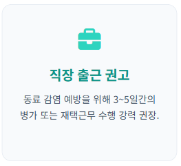 • 직장 지침: 사규에 따라 다르나, 동료 감염 예방을 위해 재택근무나 3~5일간의 병가를 권장합니다.