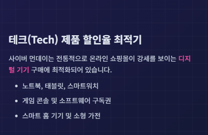 • 사이버 먼데이: 주로 컴퓨터, 스마트 기기, 소형 가전제품, 소프트웨어, 온라인 서비스 등 디지털 및 기술 관련 제품에 대한 할인율이 높게 책정됩니다. 이는 초기부터 온라인 쇼핑몰이 강점을 가진 분야였기 때문입니다.