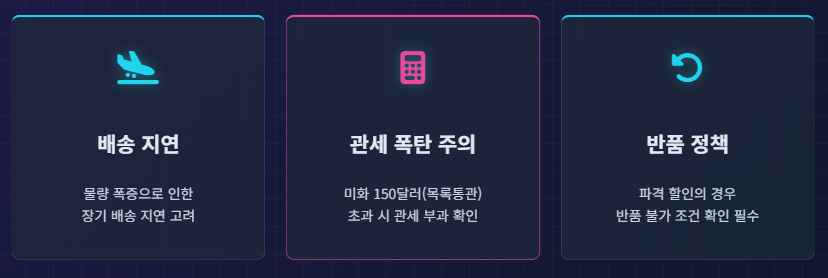 1. 배송 및 관세: 국내 소비자가 해외 직구를 할 경우, 폭증하는 물량으로 인해 배송 기간이 길어질 수 있음을 염두에 둡니다. 또한, 미화 150달러(목록 통관 기준)를 초과하는 경우 관세가 부과될 수 있으므로 합산 금액을 꼼꼼히 체크해야 합니다.